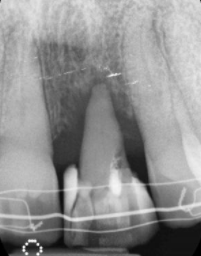 On discussion with the patient, leaving a gap was not acceptable. The patient was not interested in wearing a single tooth denture. The idea of a bridge adhesive or conventional was declined as the gum line and the excessive length of the tooth would be on show. Placing an implant even with immediate replacement on the extraction of the tooth was compromised by the almost complete lack of buccal alveolar bone. Gaining extra height of bone is considered to be difficult by standard grafting procedures. Gaining extra width is straightforward generally, but even with exotic attempts such as J bone grafts, bone height increases tend to be haphazard (except in the sinuses). Orthodontic space closure was inappropriate – the patient was too old and there wasn’t a good donor tooth available for transplantation. However, there was an option for the patient to attempt a combination of orthodontics and implant treatment.